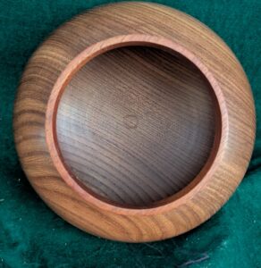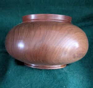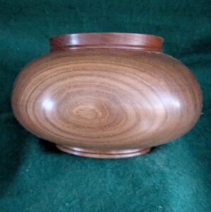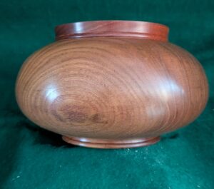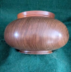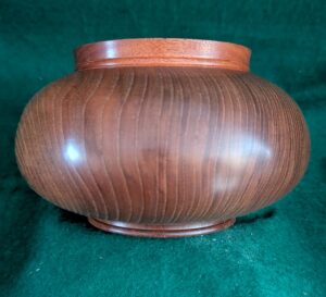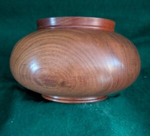 A stunning enclose form bowl made from dark elm heartwood with a Brazilian cherry standing rim. 7 inches in dia. x 4 3/8 inches tall. Perfect room decorator or for a floral centerpiece on you table. It finished with an easy to renew food safe finish and will ship with complete care instructions. As always, the shipping is included in the price.
